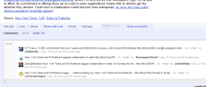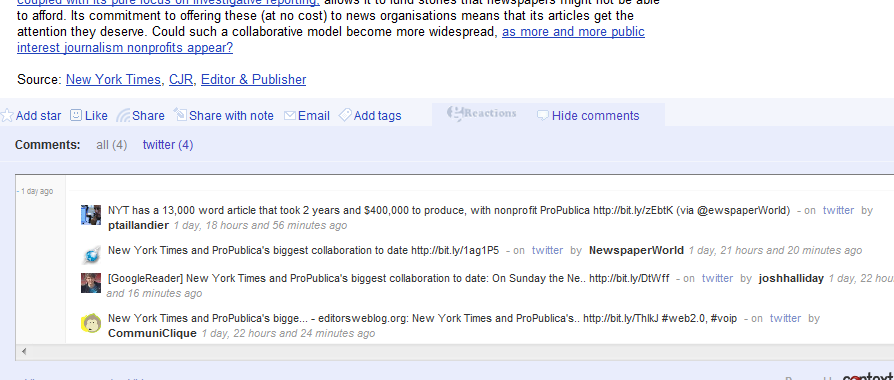 I talked at TEDx Liverpool about journalists now having a river of information available to them through social media; I later learned the River of News analogy was well-established in regards to RSS . Google has also been thinking about this RSS news river and the need for more social opportunities in our Reader, I guess, because it’s now added ‘comments’ and ‘power reader’ recommends to its options (click to enlarge the image):