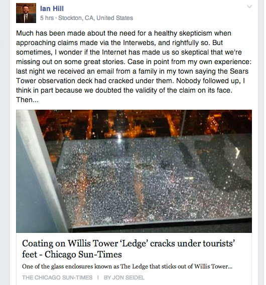I read Ian’s post and thought he made a very relevant point re verification, cynicism and the requirement to check something out because it seems too incredible to be true, but I couldn’t link to it because FACEBOOK.